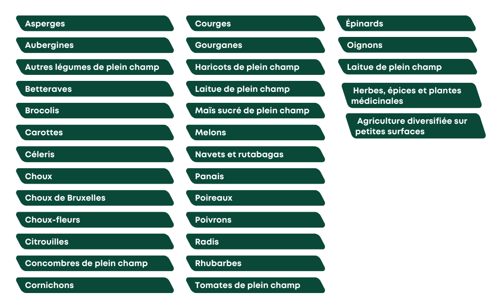 ainsi que des projets spécifiques portant sur l’oignon, la laitue, le chou, le brocoli, la carotte, et la catégorie « autres légumes ».